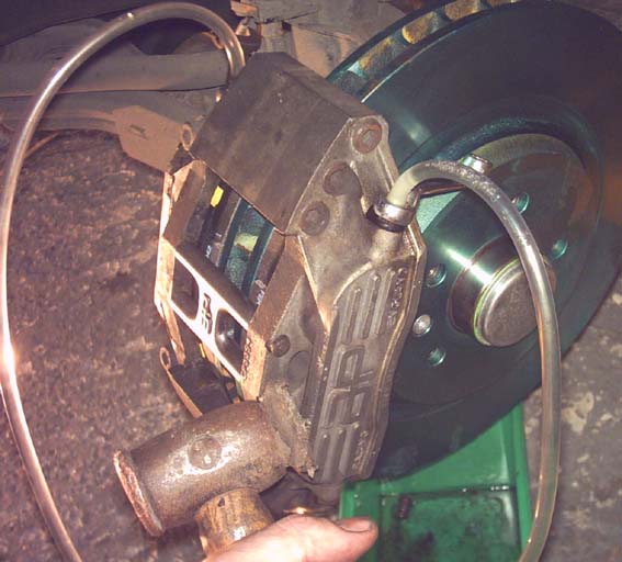 Once the discs calipers and pads have been fitted, next is the brake bleed. I favour the "eazi bleed" system, I hook this to my compressor with about 15psi, there are bleed nipples either side of the caliper, both of which need bleeding. The inner will clear the air first, the outer took a lot longer. I found it helps to tap the caliper with the hide of a copper hide mallet. The offside caliper proved difficult to get all the air out, in the event I used 2ltr of fluid whereas before I have used only 1 ltr. I used Halfords dot 5.1 non-silicone brake fluid.